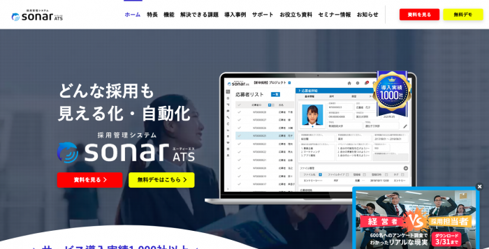 sonar ATSは、新卒と中途採用に対応することができる採用管理システムです。
