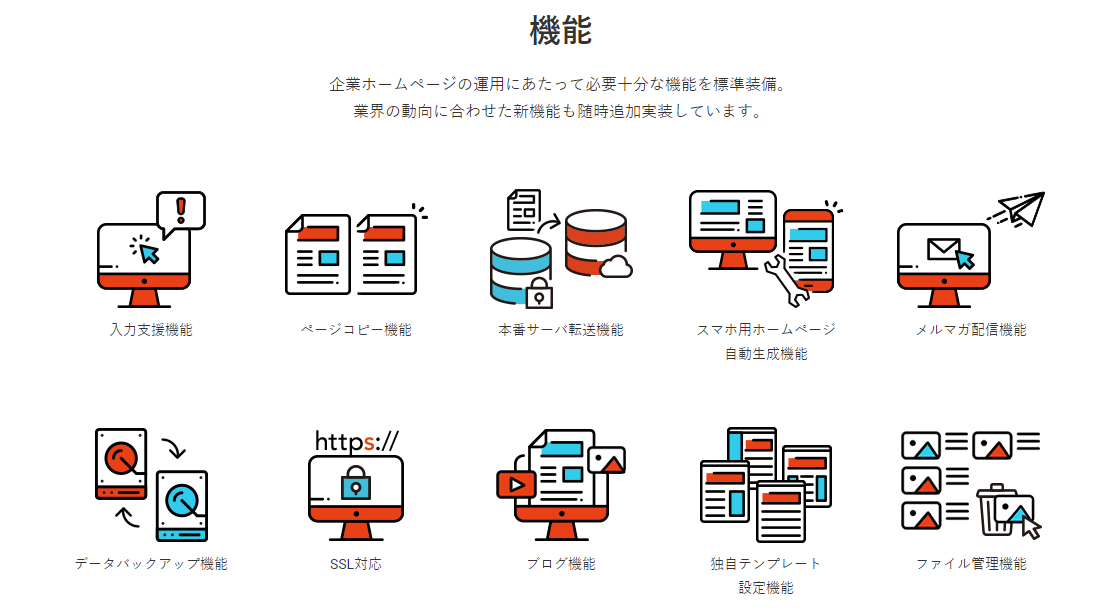 この他にも、RSS配信機能や独自のテンプレート作成機能など様々な機能が標準装備されており