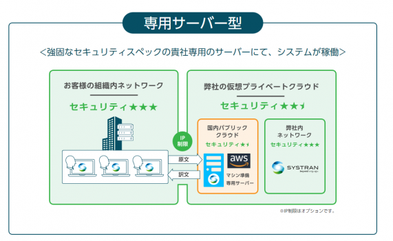 専用サーバー型プランは、SYSTRANの仮想プライベートクラウドを利用することでサービスを利用できる仕組みです。IPアドレスを制限しているため、セキュリティレベルが高くなります。