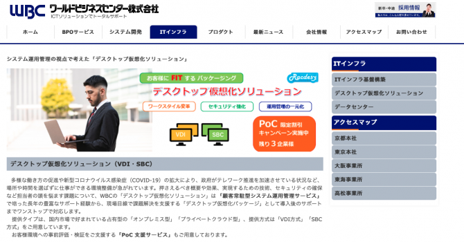 ワールドビジネスセンター株式会社は、デスクトップ仮想化パッケージの導入からサポートまでワンストップで対応してくれるサービスです。