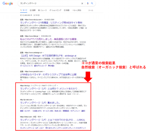 自然検索(オーガニックサーチ)は基本的にリスティング広告の下に表示されます。
