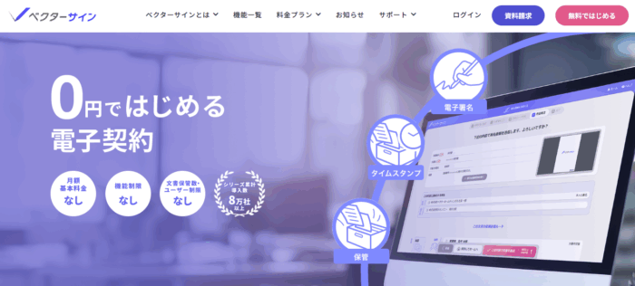 ベクターサインは、初期費用・月額料金が無料ではじめられるのが魅力です。